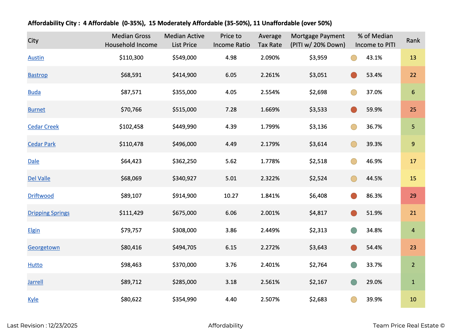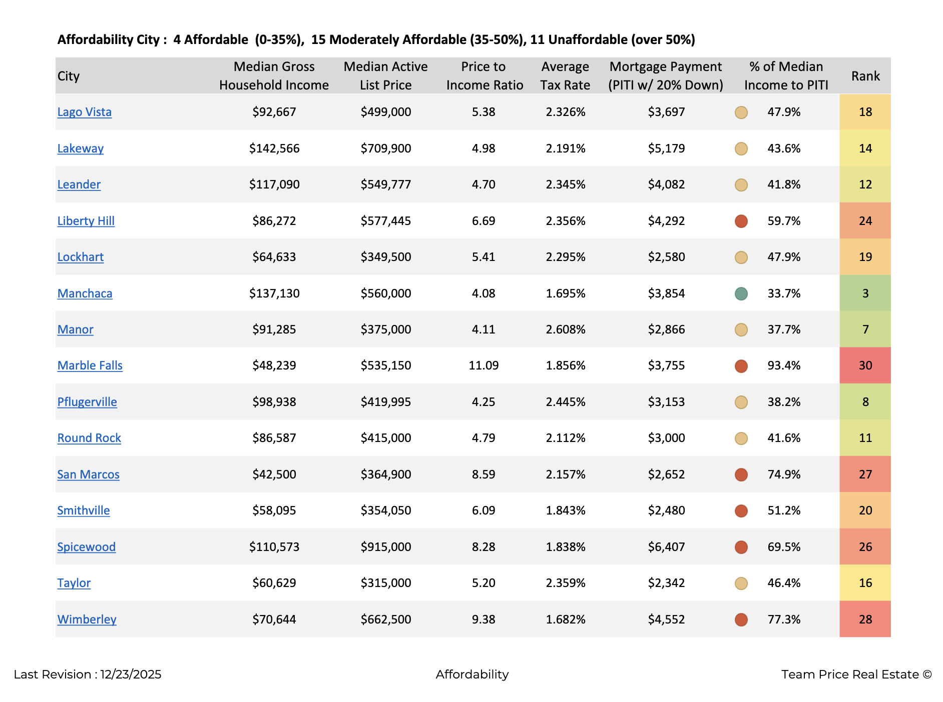 So how does the Austin area market stack up when it comes to affordability? The two charts below list the 30 major cities in the metro and indicate their affordability, based on set parameters.