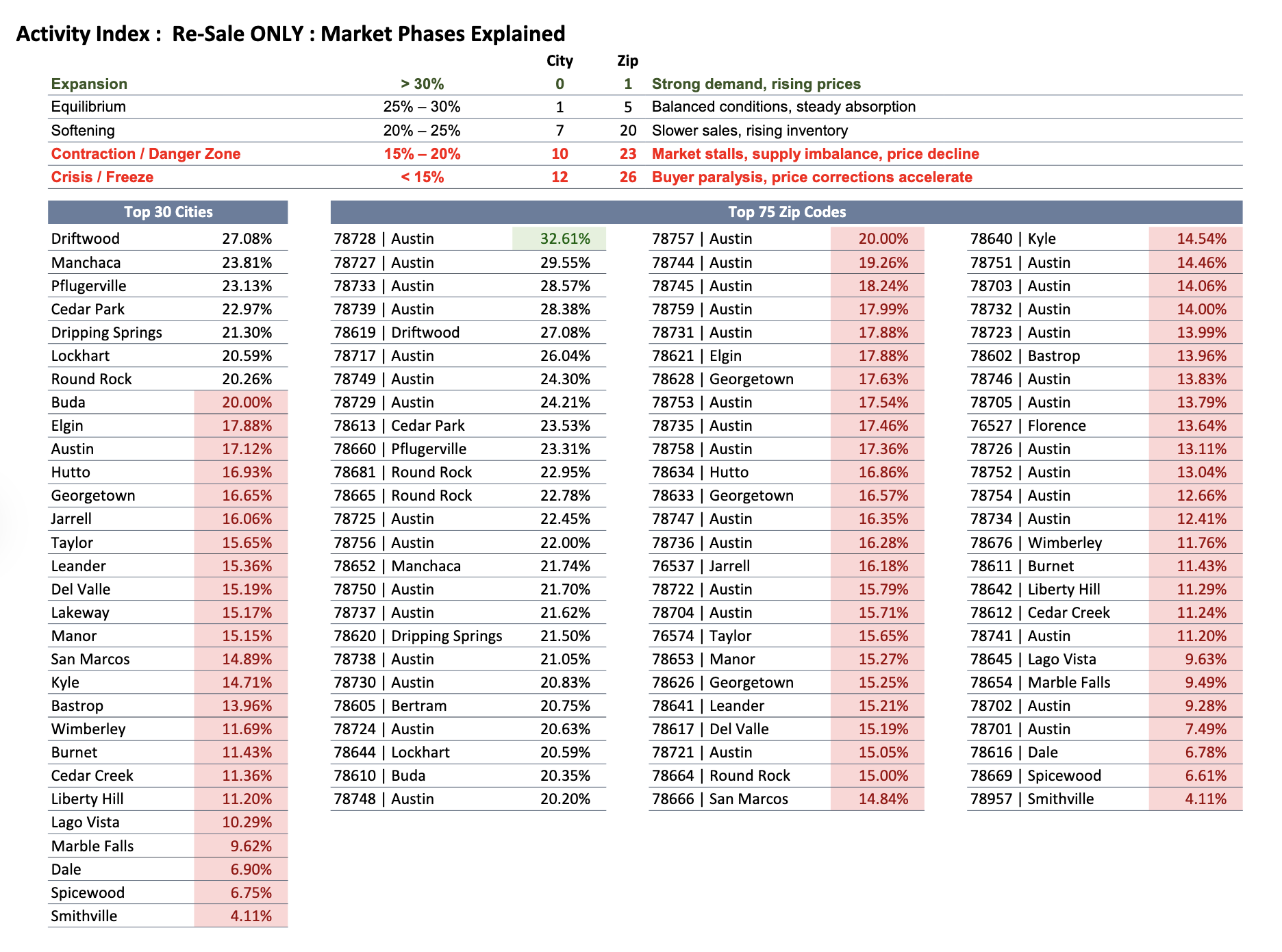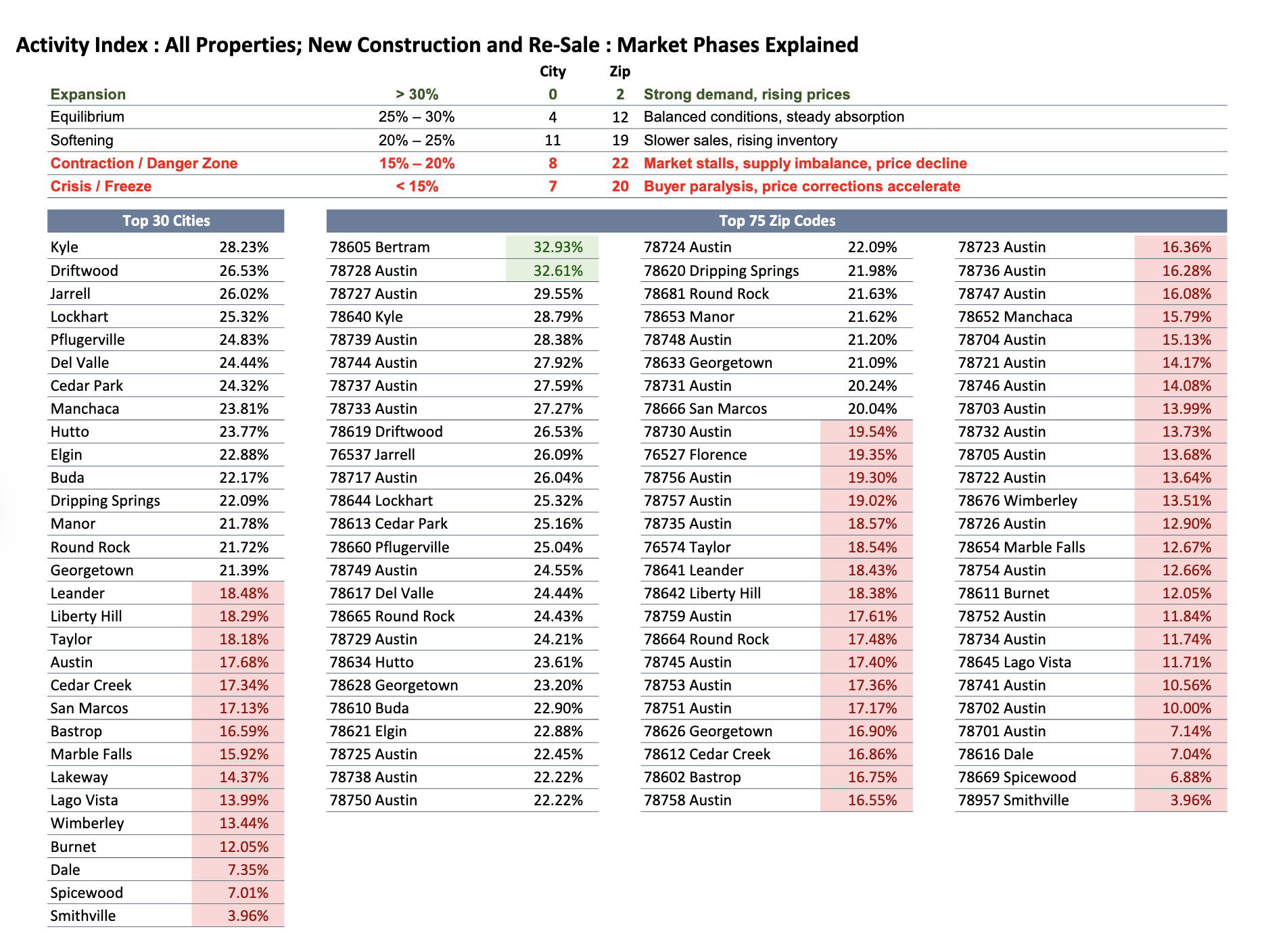 The price declines we are seeing can be attributed in large part to the Activity Index, The index reflects the ratio of pending contracts to all active listings (including pending properties). Or what percentage of active properties are being absorbed by the market. The overall ratio dropped to 19.3 percent from 22.4 percent a year ago, a 13.9 percent decline that places Austin in the contraction zone. The activity index differs by city and zip code, as well as activity among new construction and resale properties. The numbers on these charts clearly show that the "resale" market is suffering at the hands of new construction.